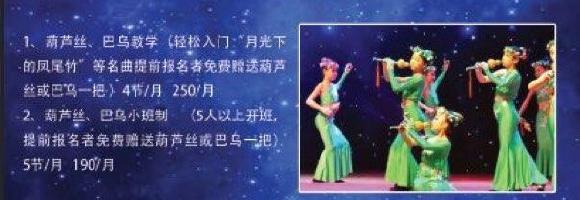 5、 葫芦丝、巴乌小班制 (5人以上开班,️提前报名者免费赠送葫芦丝或巴乌一把) 5节/月 190/月 6、声乐(流行、少儿歌曲等)4节/月 240/月