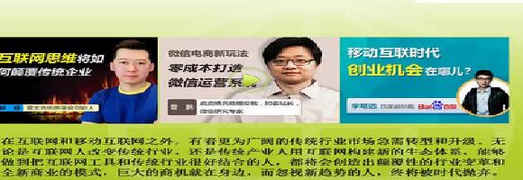 金融?理财?太初级了!2015互联网商务巅峰论坛,聚焦全新商务未来,赢在中国。优米网,一家以做职场人士以及创业者为主线的互联网在线学习培训平台。提供创业智慧的脑黄金,囊括从创业内外部环境分析、企业市场定位、团队建设、融资方案、营销促销、互联网新趋势、企业管理等课程。课程优势,以客户为中心,按需打造创业智慧课程,以具体问题为导向,突出可操作性和系统性,讲师阵容独特稀有,优米网加盟以一线企业家,行业领袖为主,专业的自制团队为视频提供品质保障,引进丰富的优质版权视频.如果您有兴趣可以联系我。丰富的线下活动,是您拓展人脉,开阔思路的优秀平台,各路一线商业精英线下培训指导,手把手教您解决方案。