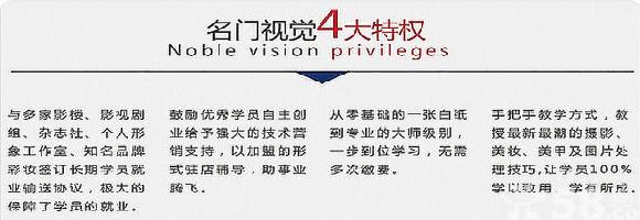 名门视觉摄影化妆培训学校创建于2004年,是集摄影培训、化妆造型培训、电脑设计培训、门市营销培训、美容美甲培训、影楼跟拍跟化、影楼样片拍摄、影楼事业发展咨询、商业广告摄影、舞台宴会化妆、职业形象设计、开店辅导为一体的综合性培训学校。本着以人为本,从社会和业界的实际需要出发,采取独特新颖的教学手法,以“以德育人、以技传人、以诚交人”的培训理念,竭诚服务,倾心育人。