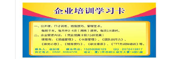 国内首家专注于定制式培训(根据客户需求定制培训内容及价格)的专业培训机构,厦门圣德奇企业管理咨询有限公司是有数位具有实战经验的高级顾问及实战培训师创办。形成以“问题为导向、互动沟通、方法工具、技能提升、实战操作”为主要特色,以关注企业长期发展及核心问题解决为最终目的;主要课程有:《班组管理实战技巧》、《销售技巧五步法》、《中层领导力与执行力》、《教练式TTT培训师培训》、《打造疯狂团队》等几个核心课程;主要的咨询项目有:【以业绩为导向的执行力体系建设】、【以业绩为导向的销售团队技能提升训练】等。