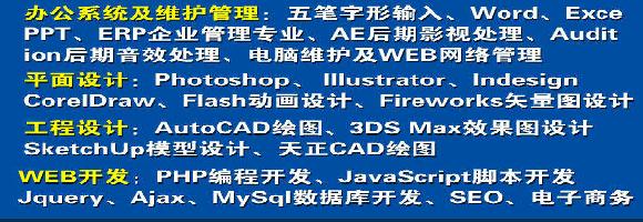 办公系统综合班、高级白领综合班、电脑维护网络管理班、网络工程班、平面广告设计师专业、室内效果图设计师专业、室内设计表现师专业、室内外建筑表现师专业、CAD施工图深画专业、CAD厨柜衣柜设计专业、php网站设计师专业、电子商务营销管理专业