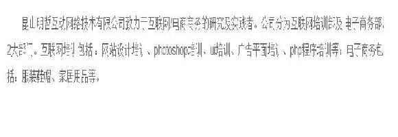 昆山明哲互动网络技术有限公司致力于互联网/电商商务的研究及实践者。公司分为互联网培训部及 电子商务部,2大部门。互联网培训包括 :网站设计培训、photoshop培训、ui培训、广告平面培训、php程序培训等;电子商务包括:服装鞋帽、家居用品等。
