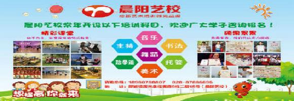 晨阳艺校,成立于2013年,是一所经工商局,税务局批复的综合性培训学校,集舞蹈、钢琴、古筝、声乐、美术、播音主持、托管等为一体的综合艺术培训学校。我们以“艺启迪智慧,术沉淀性养”着力培养艺术人才,传播高尚文化。我们为您创造一流的环境,一流的管理,一流的师资,一流的质量,引你走进艺术的殿堂! 本校老师均来自四川音乐学院、四川大学、四川师范大学、四川传媒学院、西南交通大学、西南民族大学和西华大学等高校,针对每个人的情况和要求,制定最适合学员们的教学方法。 奏金色时代,绘蓝色未来,舞缤纷世界,羡慕别人不如让人羡慕,赶快加入我们吧!