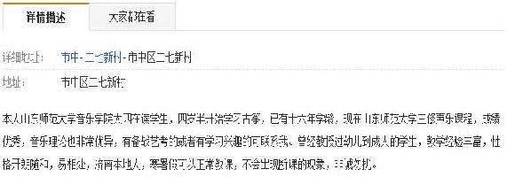 本人山东师范大学音乐学院大四在读学生,四岁半开始学习古筝,已有十六年学龄,现在山东师范大学主修声乐课程,成绩优秀,音乐理论也非常优异,有备战艺考的或者有学习兴趣的可联系我。曾经教授过幼儿到成人的学生,教学经验丰富,性格开朗随和,易相处,济南本地人,寒暑假可以正常教课,不会出现断课的现象,非诚勿扰。