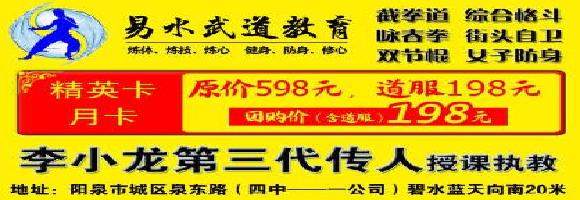 张铭宇先生于2012年开始在阳泉进行李小龙功夫的推广和传播,易水武道自2014年初正式成立以来,以严谨的教学态度、实用的教学内容、而广受家长及学员好评,而且有很多已有3-5年其他武术基础的学员慕名前来学习和进修。经营地址:山西省阳泉市城区泉东路中段如家酒店往南100米易水武道
