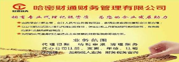 哈密财通财务管理有限公司是经哈密市工商行政管理局登记注册,经过哈密地区财政部门审批的正规专业会计服务机构,拥有一支涉税经验丰富,业务素质及专业技能颇高的会计队伍,具有多年从事企业会计工作经验,为客户提供专业、诚信、高效的服务,是一家专门服务于中小型企业的专业代理记账公司。
