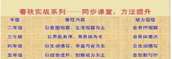 1、 低年级段注重学生写作兴趣的培养,高年级段注重写作能力的提高和写作方法的归纳学习,以及小升初备战的专项训练!